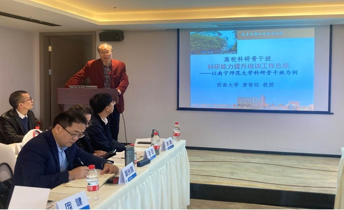 唐智松教授作为校地合作高校学段的代表在发言中以南宁师范大学科研骨干班为例对科研能力提升与培训工作进行了总结。他认为南宁师大取得显著成效主要有学部领导的全力支持、项目团队的全力投入、研修活动的针对性安排、导师指导的个性化和后期有效跟进。同时唐老师站在合作方立场提出对方领导的支持不可替代、参训学员的理解不可或缺、关键人员的联络至关重要。最后他建议把社会工作服务事务当作学术生命完善来做,把社会工作服务工作当学术行动调研来做,把社会工作服务反思当学术作品思考来安排,把社会工作服务改进当学术前沿问题去追求。