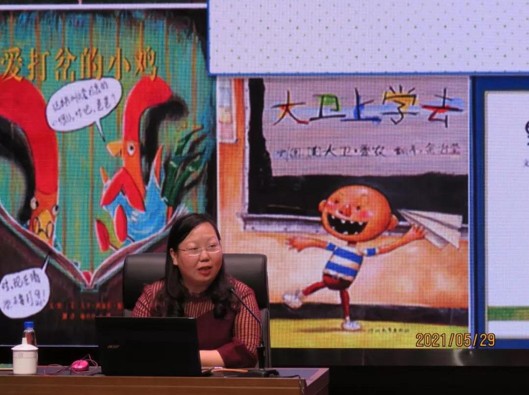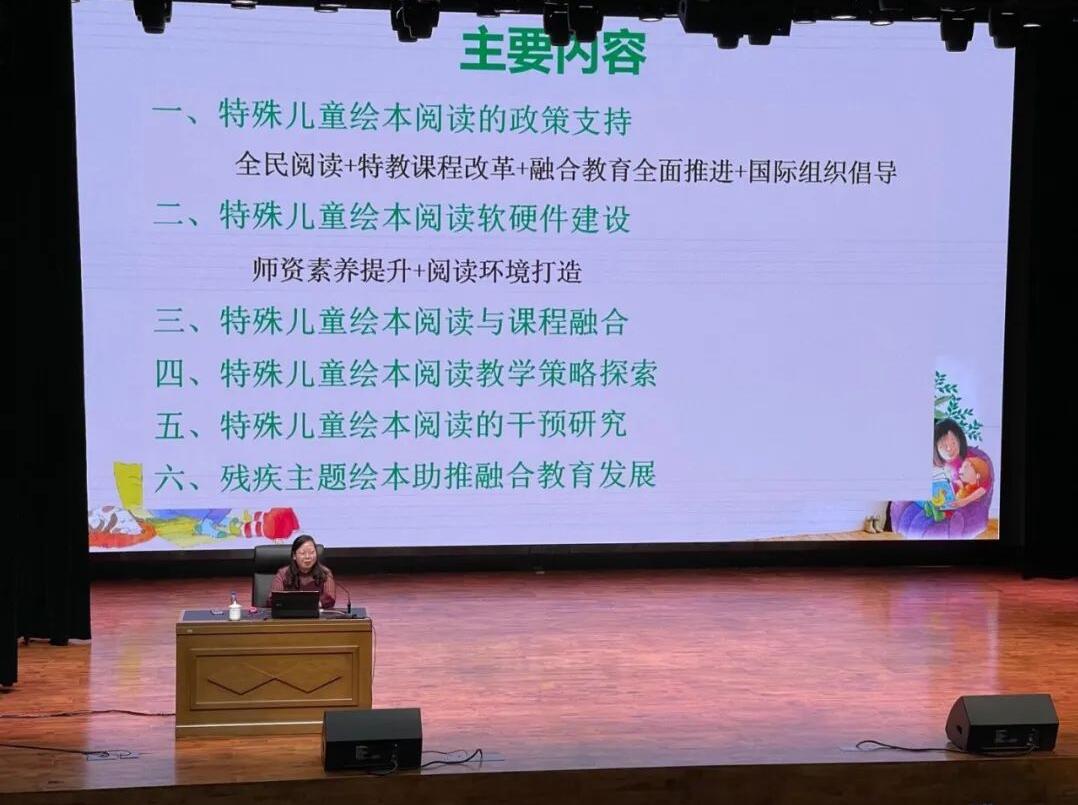 在“绘本助力 全民阅读”环节,学部教师江小英和河北省教育厅机关党委专职副书记刘殿波分别围绕《特殊儿童绘本阅读的发展趋势与教学实践》和《绘本在特殊教育中的应用与前瞻》进行了探讨。在讲座中,江小英老师从政策支持、软硬件建设、与课程的融合、教学策略探索、干预研究和助推融合教育发展等六个方面概括了特殊儿童绘本阅读的发展趋势,并结合全国多所特殊教育学校和指导中心的实践案例进行了解析,讲座内容深入浅出,汲取国际经验,着眼本土实践。参会者还现场观摩了中山市特殊儿童教养学校师生带来的一堂生动有趣的绘本展示课《小小迷路了》,孩子们的精彩表现让人几乎忘记他们是佩戴助听器或植入人工耳蜗的听障幼儿。讲座和现场展示课使参会教师及家长提高了绘本阅读的热情和信心,更新了绘本阅读的观念和策略。根据疫情防控要求,主办单位对现场人数进行了缩减,为服务全国广大特殊儿童教师及家长的需求,开通了线上直播,会议结束前在线观看已超过4000人。