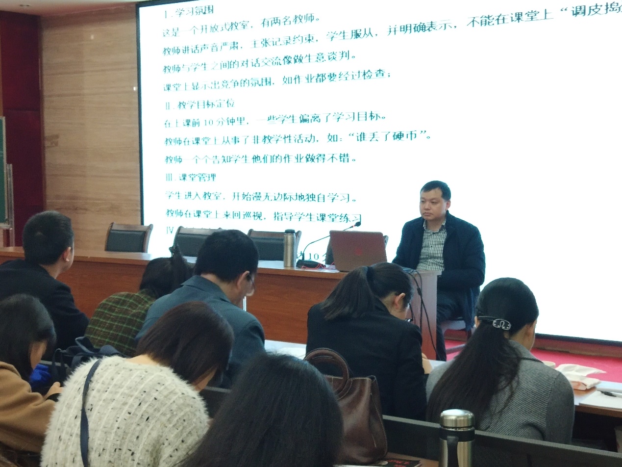 王天平教授做了题为《有效的课堂教学观察与评价》的讲座,针对当前专业化课堂评价过于繁琐、不适合一线教师有效评价课堂的突出问题,提出教学目标、教学活动、教学评价一体化的课堂评价理念,在此基础上引导教师按照必要的课堂观察步骤进行课堂评价实操,并将课堂评价信息提炼成为微型教学论文,从实现了课堂教学、课堂评价和教学科研有机整合。