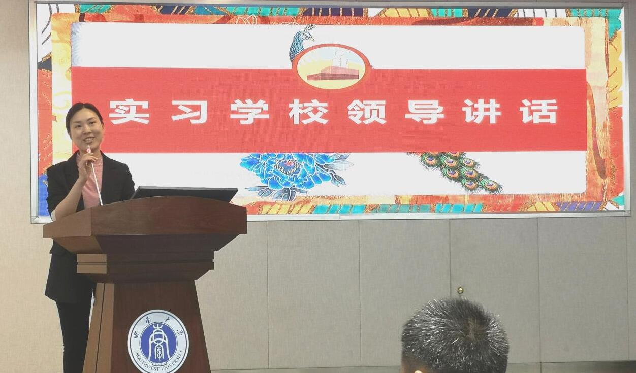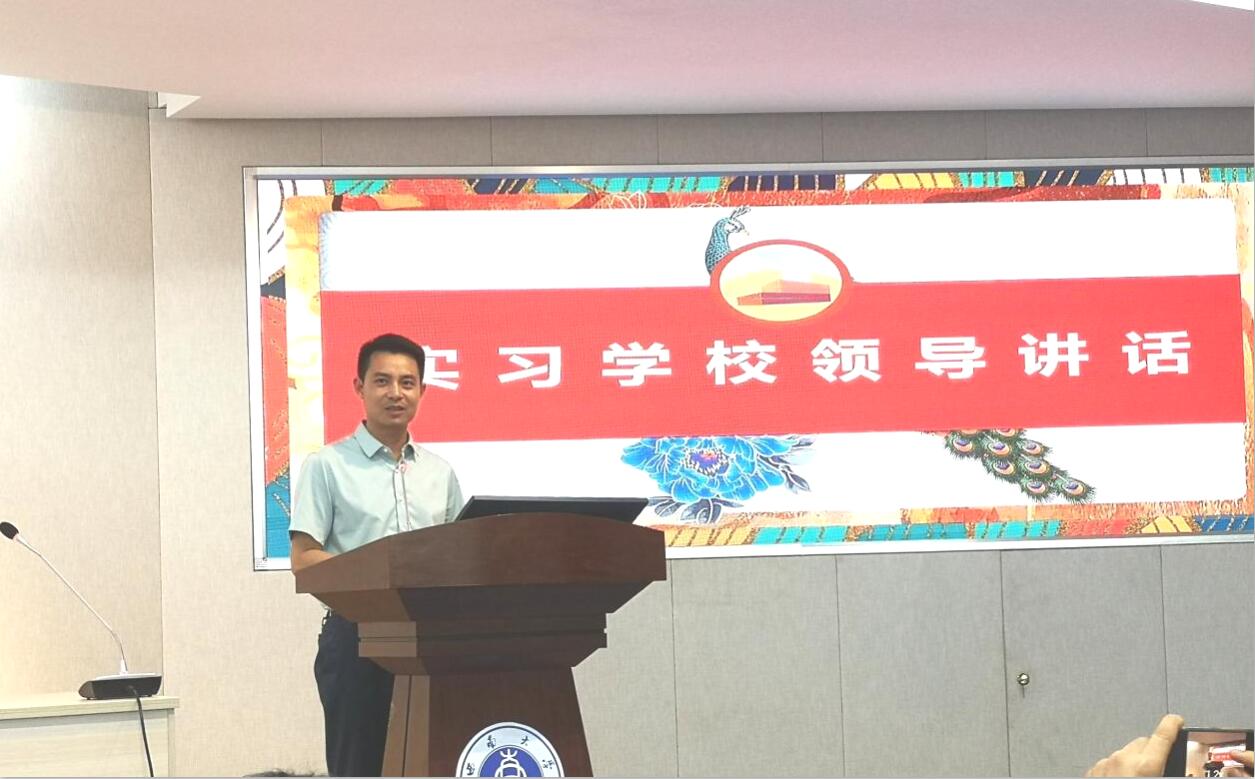 接着,实习学校领导发表讲话。郭勇副校长以“风正潮平,自当扬帆破浪;任重道远,更须策马扬鞭”寄语,希望同学们在未来的教育之路上永葆初心,争做“四有”好老师。丁历黎副校长用一首小诗表达了与实习同学们美好相遇的感动和祝愿,“遇见美好,愿同学们与美好相伴,在自己的人生道路上,做自己的状元!”。