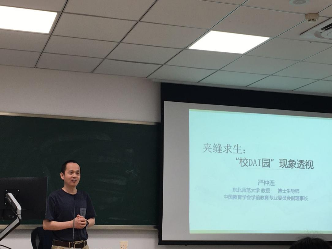 2021年5月29日晚七点,学前教育专业博士研究生和硕士研究生在田家炳518教室聆听了一场由东北师范大学教育学部学前教育学科负责人、博士生导师严仲连教授带来的关于《校DAI园现象透视》的讲座。本次讲座由教育学部李姗泽教授主持。