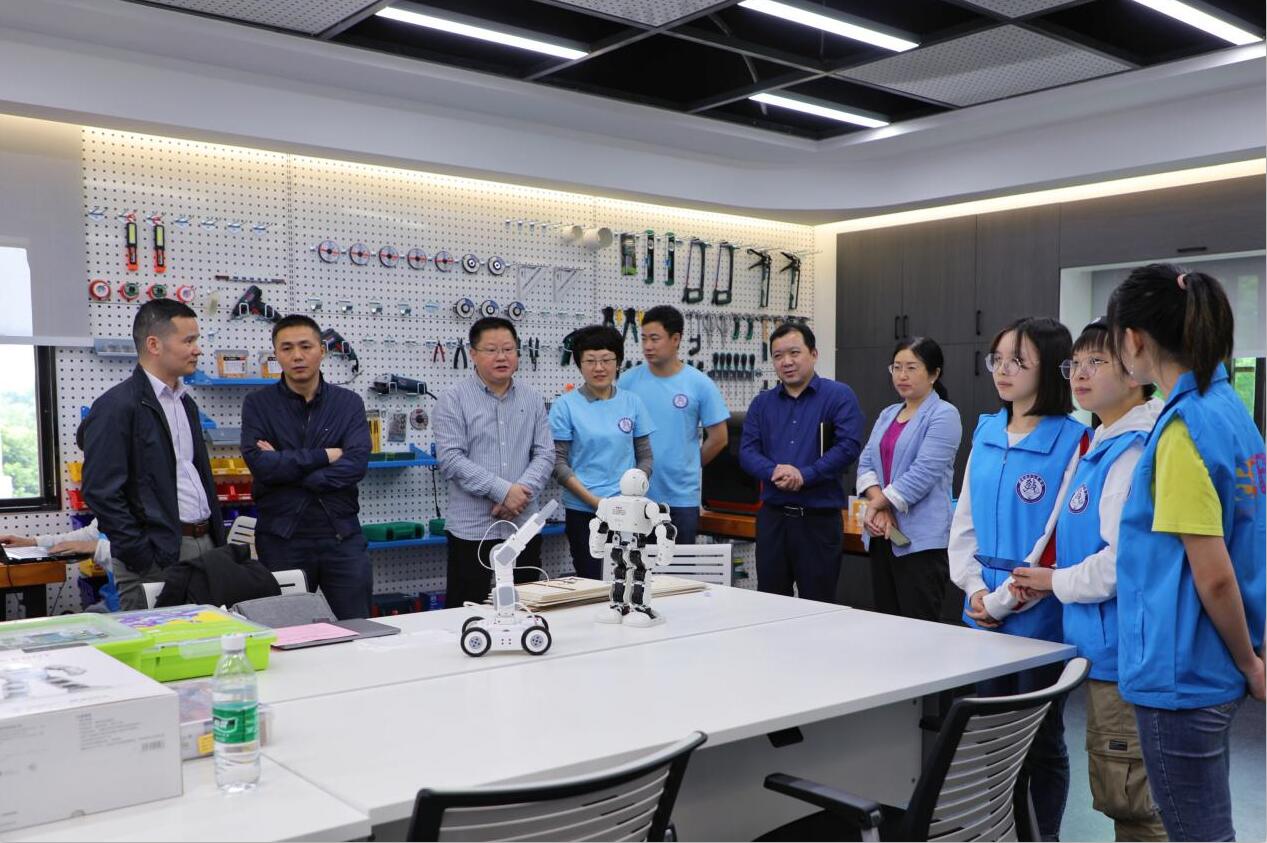 最后,王正青副部长陪同张斌院长参观了各个新建实验室,在参观过程中,学生代表袁桂琳介绍了拟申报的“互联网+”大学生创新创业大赛项目“机器人+教育,铸牢红色文化传承引领者”,张斌院长充分肯定了同学们的创意和设计,鼓励深入探索下去,并希望更多的同学积极参与到创新创业实践中,充分利用好学部打造的创客空间,取得更加优异的成绩。