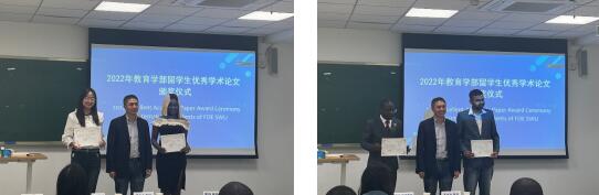 随后进行了2022年教育学部留学生优秀学术论文颁奖仪式。本次优秀学术论文奖包括一等奖2名,二等奖2名,三等奖5名。教育学部副部长罗生全教授分别为优秀学术论文奖和最佳海报设计奖颁奖。