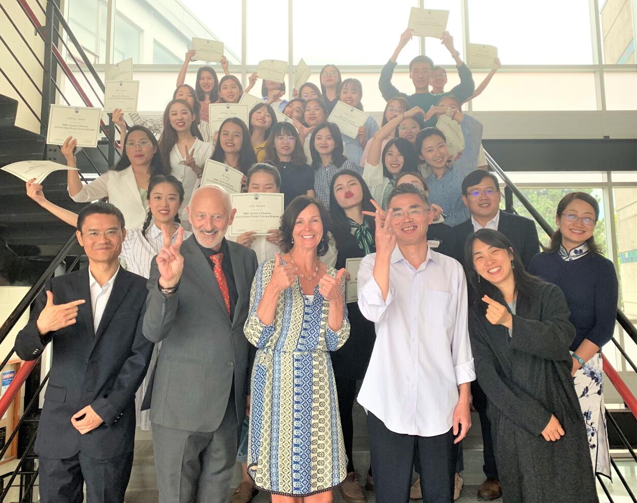 8月16日下午,UBC教育学院副院长Marianne McTavish教授、国际部主任王方博士和项目学术领导Tom Grant教授为访学团举行了简短而隆重的结业典礼,依次为25位同学授予毕业证书并合影留念。最后,双方老师互赠礼物,表达良好祝愿,对未来双方进一步合作与交流满怀信心与期待!