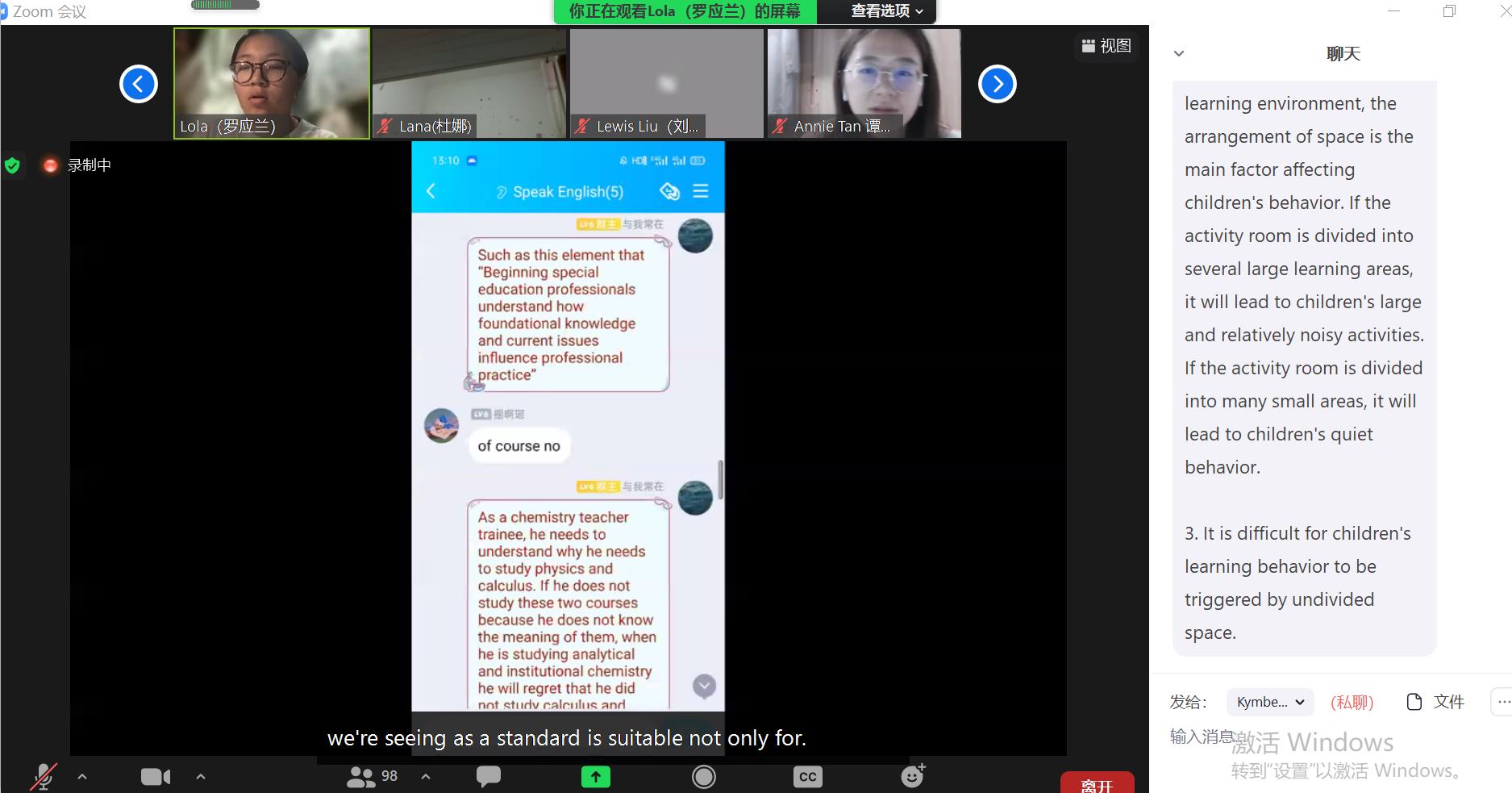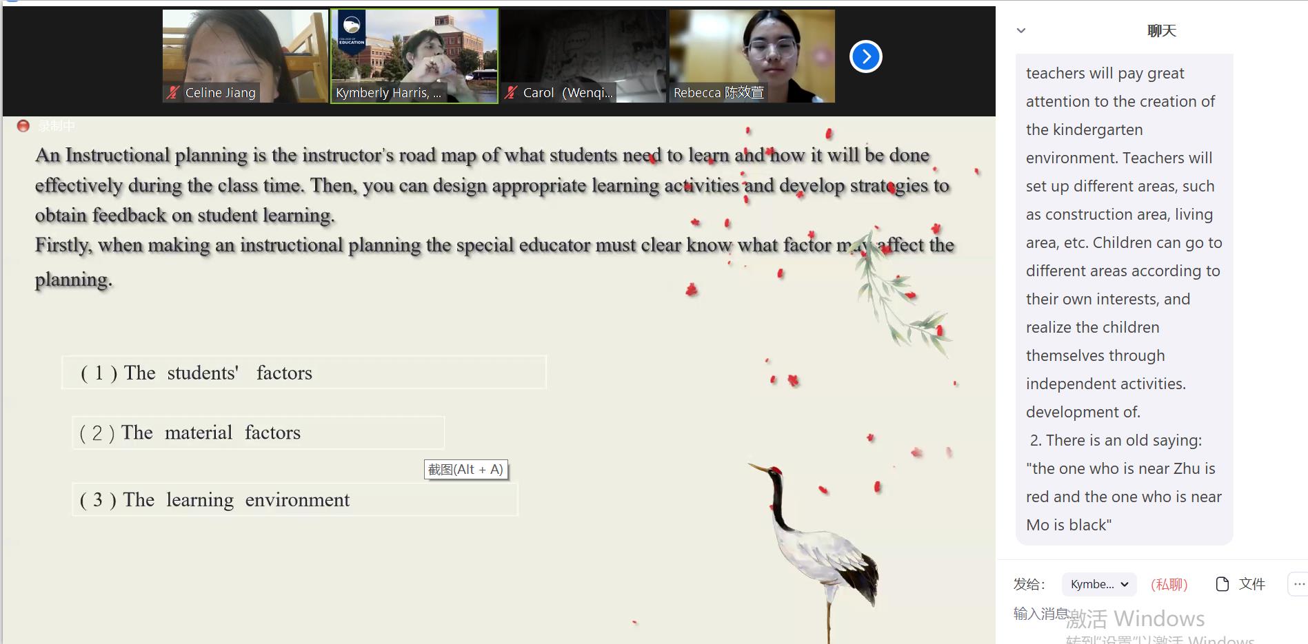 由于疫情等原因,本年度的暑期国际周课程主要采用线上授课形式。本课程深受教育学类学生青睐,选课总人数达99人,学生包括教育学部2018级、2019级、2020级本科生(专业包括:特殊教育、学前教育、教育学、教育技术学)以及2020级特殊教育学专业的研究生。为了保证线上教学有效开展,共课教师江小英副教授于7月10日晚8点通过腾讯会议举行国际周课前安排与辅导会,为选课学生介绍了《教学和行为管理方法》授课老师的基本情况,课程的时间安排、教学视频软件的使用以及注意事项等。通过这次会议,同学们对国际课程了解更加清晰,对正式的课程充满了无限期待。