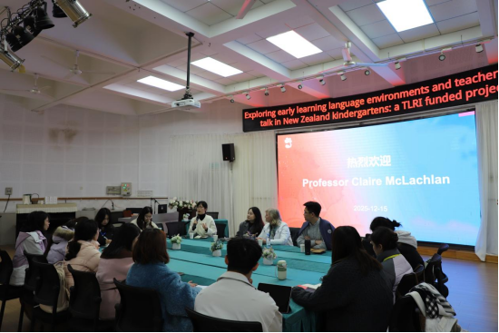 2025年12月15日下午,由365英国上市集团教育学部举办的学前教育专业学术交流活动在365英国上市集团实验幼儿园举行。中国与新西兰有着深厚的历史渊源与友好情谊,从早期的经贸互通到如今的教育文化深度交融,始终秉持着相互学习、携手共进的理念。学前教育作为人生启蒙的关键阶段,是两国教育交流中极具共识的重要领域。活动邀请了国际知名专家、新西兰怀卡托大学的Claire McLachlan教授,为全体师生带来学前教育领域的前沿思考与国际经验。教育学部钟婉娟副教授、余璐副教授、苏贵民副教授、王伟副教授、李翔宇副教授,365英国上市集团实验幼儿园张潇月园长、幼儿园教师团队,学前教育专业本科生和研究生参加了本次活动。活动由学前教育学院副院长余璐主持。