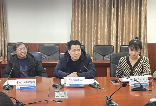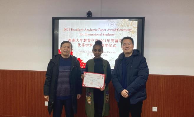 In order to promote the output of high-level innovations, improve the quality of postgraduate programs, and guide and encourage international students to create and publish high-level papers with both academic and social value, the Faculty of Education of SWU held 2021 Excellent Academic Paper Award Ceremony in room 504 of Tian Jiabing Building, January 11st, 2022. Prof. Liu Chengyu, Dean of International College, Prof. Wang Muhua, Party Secretaty of FoE, Dr. Dai Huapeng, Director of International Center, Dr.Wang Xue, Director of the English-taught Program, Associate Prof. Hu Yanjuan, Associate Prof. Tang Ying, Associate Prof. Zhong Wanjuan, Dr. Li Xueyin, the Head Teacher of Grade 202, Dr. Zhou Ling, the Head Teacher of Grade 2018 & 2021, and all international students of the faculty participated in the event. Other students who are not on campus watch the live stream in Ding Talk. The ceremony started from was hosted by Director Wang Xue.