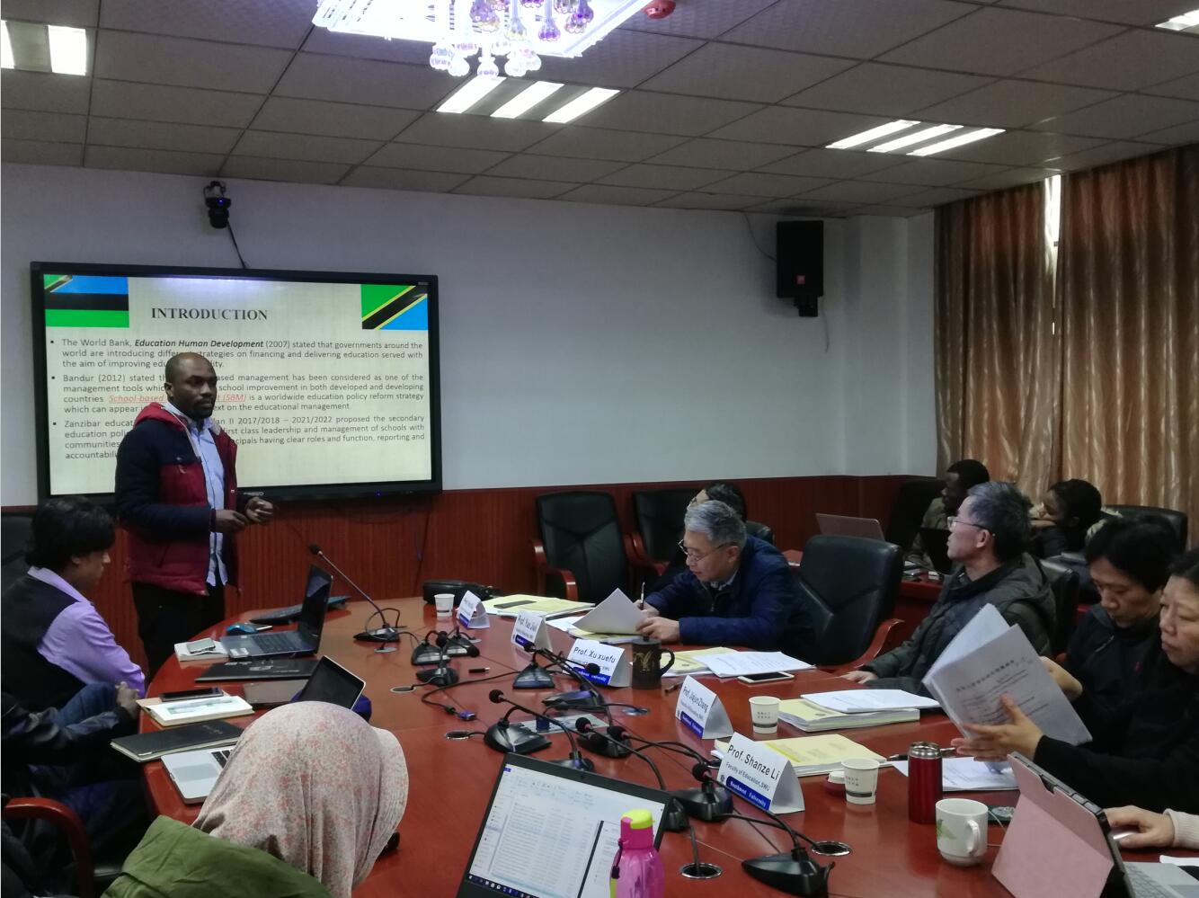 为了解三年级留学生学位论文的写作进展、及时指导他们解决论文写作过程中遇到的困惑和问题,2019年12月23日下午在504会议室,6位2017级全英文留学生进行了学位论文进展报告,18级全体和部分19级全英文留学生参与聆听。此次报告会主席为徐学福教授,委员为么加利教授、徐辉教授、张家军教授、李姗泽教授,班主任周玲老师主持并总结发言。