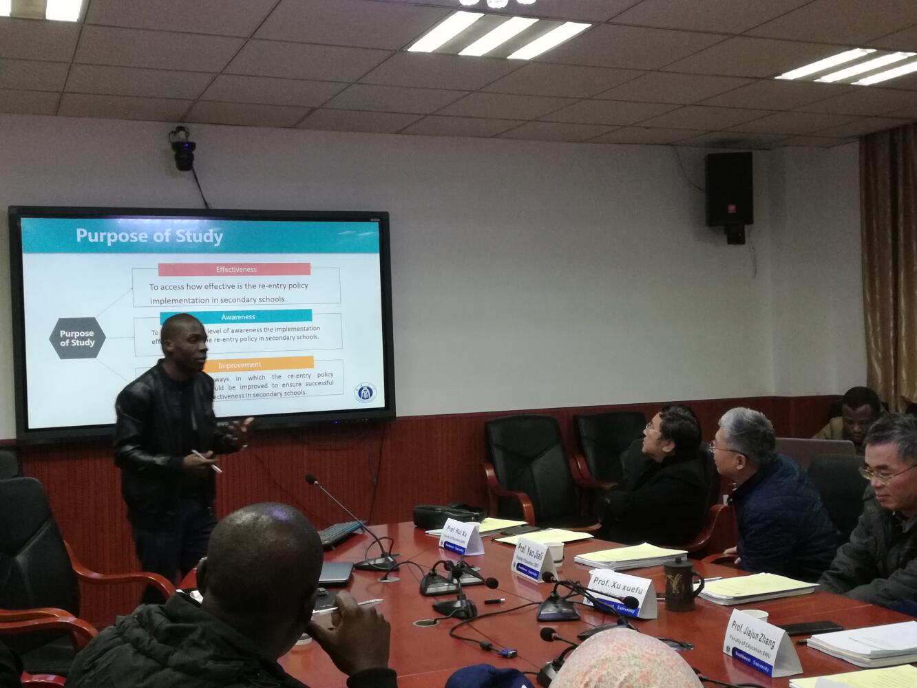 硕士生Muyunda Gift结合赞比亚当地受教群体的特点,提出研究“实施重新返中学学习的政策的有效性”。徐学福教授建议本研究需明确研究目的与想要达成的效果。