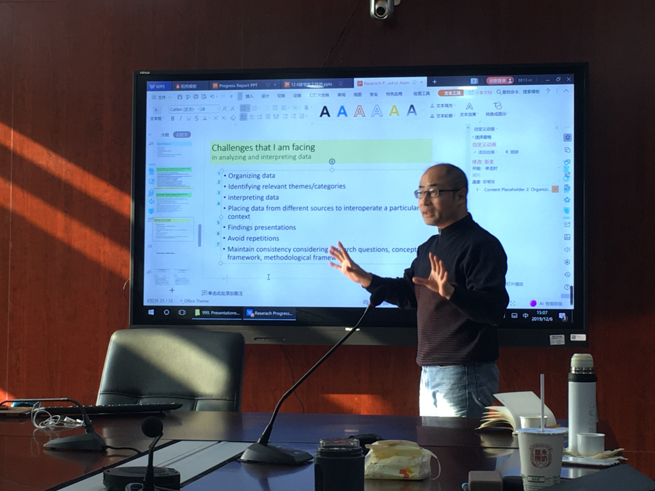 工作坊的讨论十分民主和谐,在轻松的氛围中,同学们积极思考,勇于提出自己的想法和老师共同探讨。尹教授不时走下座位,针对PPT呈现的某部分内容提出疑问,与学生面对面进行商榷,一针见血地点出问题,并给出了有针对性的建议。尹教授建议在座同学,尝试将论文的理论框架与数据分析的主题联系起来。