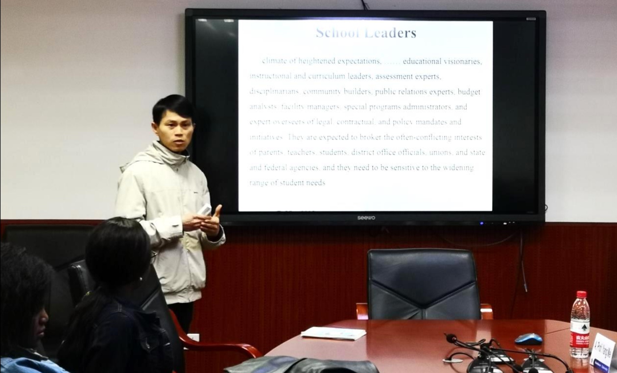 首先进行汇报的是越南籍博士生Tran Quang Bao Phuc。他基于“教育领导力环境对学校影响”视角,介绍教育领导力在越南的最新研究进展,并从经济、政策、文化等多维度分析了越南教育领导力发展所面临的机遇与挑战。