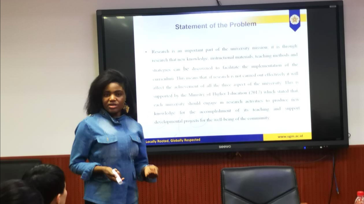 最后进行分享的是学部另一位尼日利亚籍硕士留学生Obiasoanya Kosiso Modest,其研究计划聚焦于“科技对教育的影响”。她以“尼日利亚阿南布拉州基于信息和通信技术的学习对中学生学习成绩的影响”为主题进行了汇报,分享了其研究目标、梳理文献、研究方法、研究意义等方面内容。