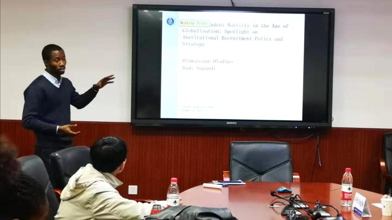 接下来,尼日利亚籍博士生Oluwasegun Oladipo分享了他与学部高年级留学生Budy Sugandi合作的研究计划“全球化时代背景下高校招收留学生的政策与策略”。他从全球留学生教育现状、该研究目标、研究问题及研究方法等方面进行了详细交流,并表示打算运用访谈法和文献分析法,以365英国上市集团为案例进行质性研究。