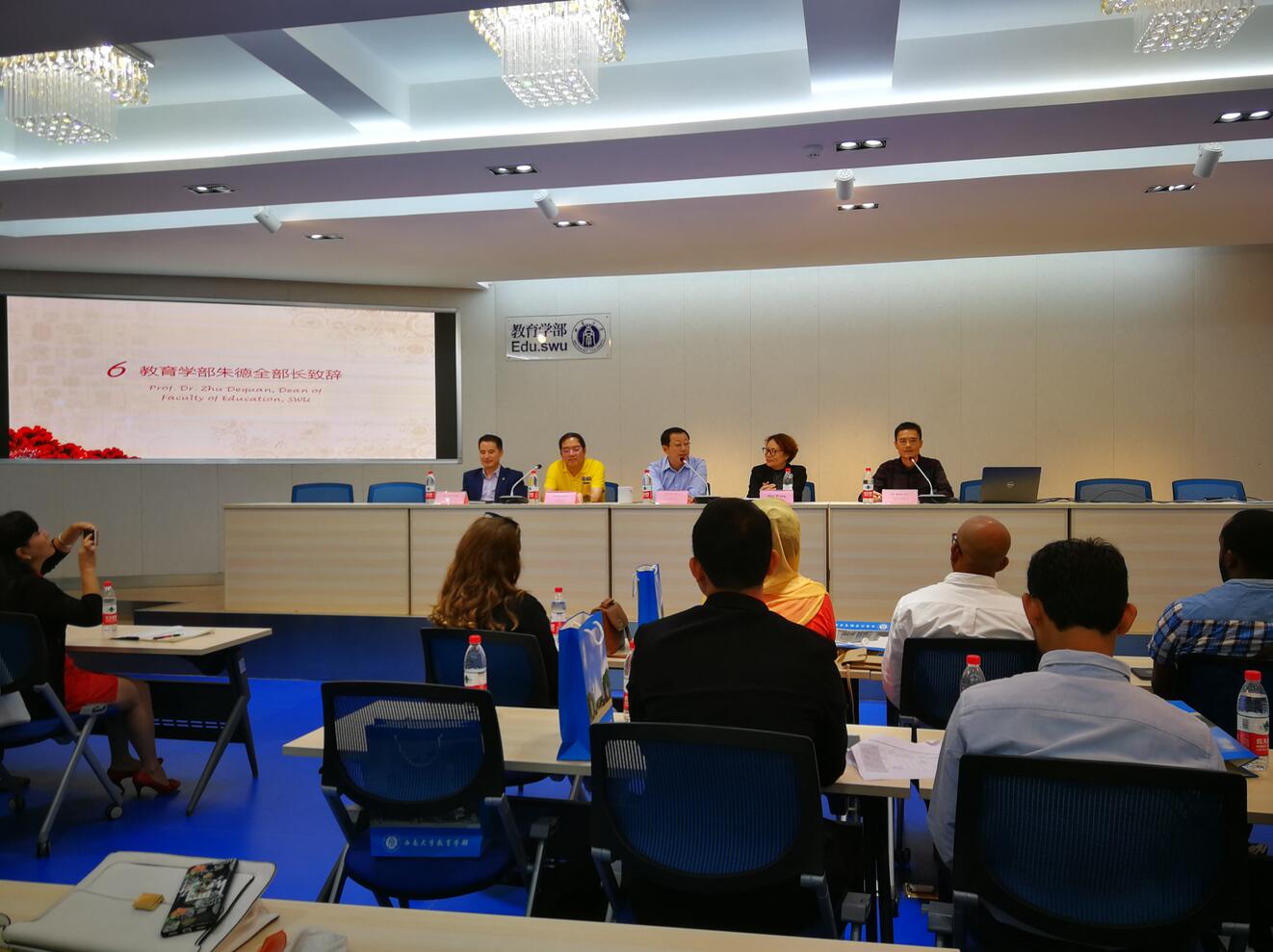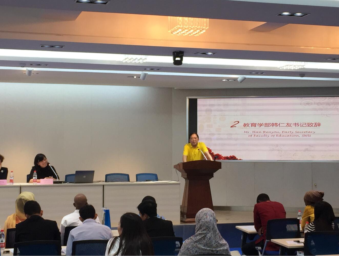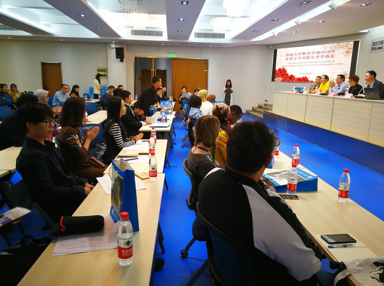 出席本次开学典礼的有:教育学部朱德全部长、国际学院王静院长、教育学部党委书记韩仁友书记、教育学部王牧华副部长和国际合作交流中心主任戴华鹏,还有全英文留学生的全体导师和授课教师。为来自15个国家的21名全英文项目留学生举行开学典礼。