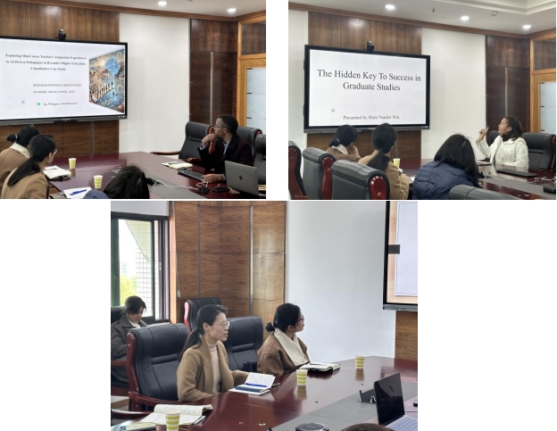 接着,Philogene Manirahari同学进行了以高等教育中的人工智能驱动教学为主题的汇报,该研究采用定性研究方法,以创新扩散理论和变革性学习理论作为理论框架,探讨卢旺达高等教育中职业生涯中期教师对人工智能驱动教学法的适应经验。最后,Hnin Nandar Win同学从自我领导力提升的角度出发,分析了当前缅甸高等教育在培养研究生分析性和批判性思维以及自我领导力的不足。汇报结束后,胡老师和杨老师首先肯定了两位同学研究视角的新颖性,两位老师也同两位同学讨论如何使研究背景阐述更加具有完整性、逻辑性、条理性。