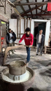 随后,在刘馆长的指导下,师生们亲自体验了传统农活——磨豆浆。大家分工合作,有的负责推磨,有的负责添豆加水,忙得不亦乐乎。经过一番辛勤劳动,新鲜的豆浆终于磨好了。大家围坐在一起,品尝着自己的劳动成果,脸上洋溢着满足的笑容。