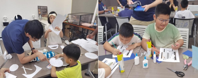 511教室的三大项目同样各具特色。“星轨捕手”通过剪纸工艺让孩子们感受“指尖上的星空”,在手工创作中探秘星世界。“数字古镇构架师”以传统建筑与民俗文化为核心,引导孩子们通过手绘图还原古镇的历史韵味与烟火气息,在笔墨勾勒中感受传统文化魅力。“探秘未来之城”则巧妙结合模块化建筑、LED灯光等装置,以光影交织的方式展现现代城市的繁华节奏与未来感,激发孩子们对未来城市的想象与创造热情。