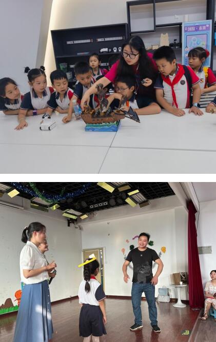 接着,研学团队来到教育学部参观实验室。创客实验室的志愿者为大家展示了机器人跳舞的功能,孩子们的好奇心一下子就被调动起来,各种科技作品让他们应接不暇。在儿童剧场,孩子们和家长玩起了“你比我猜”的亲子互动游戏,小朋友们玩得不亦乐乎。游戏结束后,孩子们一同唱起了《孤勇者》,儿童剧场响起了他们稚嫩、飒爽的歌声。