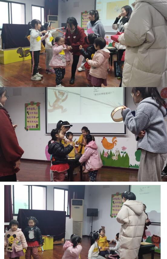 “梆——梆梆”随着故事深入,老师手中小鼓的声音逐渐紧凑起来。小朋友们环成一圈坐在讲台前,跟着讲读老师地讲述走进“猫鼠大战”,“老鼠偷了东西,猫才捉老鼠”“是因为老鼠” “木马”“鱼竿”……在两位讲读老师绘声绘色地讲读和小朋友们积极讨论中,故事逐渐到了尾声。