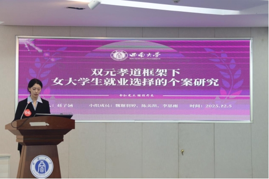 在非师范场决赛现场,七个参赛小组分别从研究背景、研究思路与方法、研究结论、不足与展望等多个方面对研究成果进行了细致入微的汇报讲解。其中,贾祯同学带来的《数字化背景下大学生阅读模式对主观幸福感的影响研究》聚焦数字阅读对大学生主观幸福感的影响,通过构建以心流体验和学业自我效能感为中介的理论模型,揭示了碎片化与沉浸式阅读模式的心理机制;聂子涵同学带来的《双元孝道框架下女大学生就业选择的个案研究》基于四个案例的深度访谈与文本分析,阐释了孝道信念从权威服从向情感互惠转化的动态机制,并提出不同家庭互动模式下个体采取的协商对话、空间赋权与家庭重构等策略。