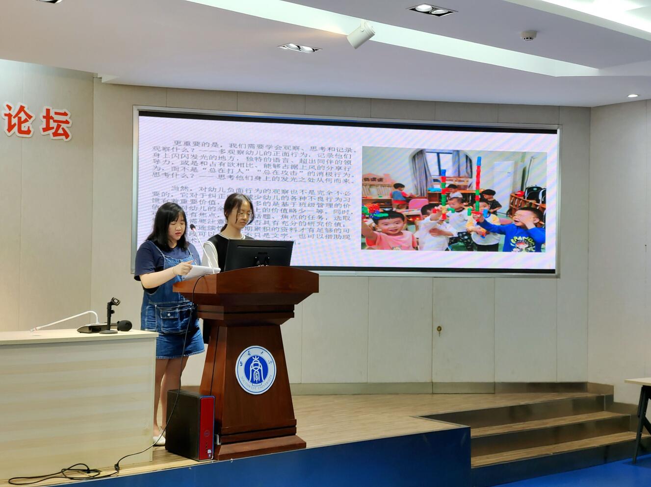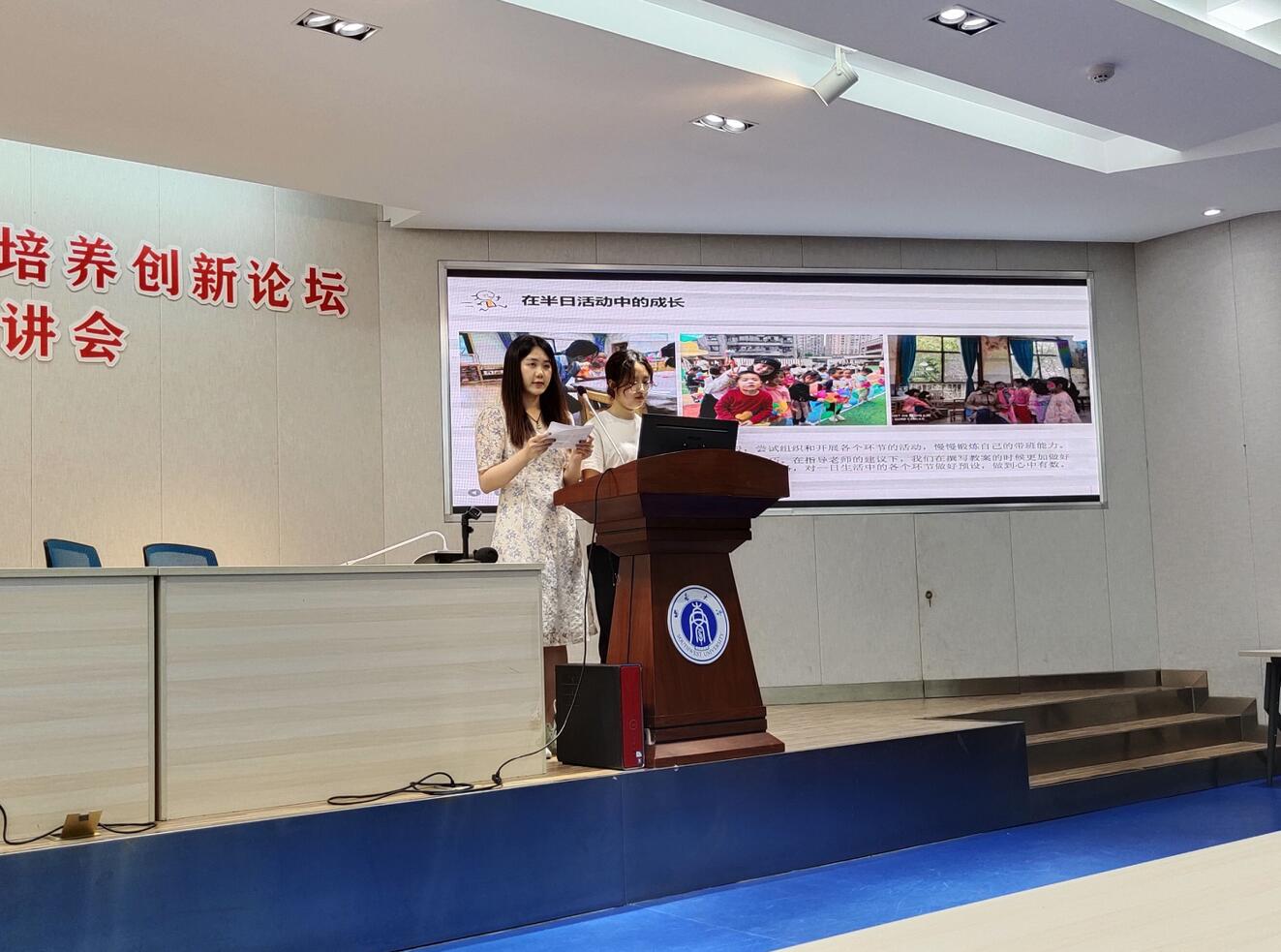 首先,学前教育师范班的实习同学分别从园所介绍、实习挑战、实习收获、感悟与反思等板块进行汇报。江津区鼎山幼儿园的同学以“知行合一、学思并举”作为其实习主旋律,在实习中兢兢业业、上下求索,提升自己的环创经验也丰富教学体验,并提出“道之所在,虽千万人吾往矣”的教育宣言;几江幼儿园的同学在实习中有欢笑有泪水,通过实习活动,获得挑战新事物的底气和力量,锻炼自己成为合格的幼儿园教师;365英国上市集团实验幼儿园的同学们面对实习中的困难不气馁、不妥协,克服教育理论与实习经验的隔阂,解决了一个又一个实习难题;渝北幼儿园的同学收获知识,迎接挑战,从“小白”教师蜕变成得心应手的专业人员,开展了《建筑师杰克》《认识薄荷》《情绪小怪兽》等精彩的教学活动;渝中实验幼儿园的同学们在幼儿园“人和至爱,谐以养正”的办园理念的影响下,转变教育视角,上能将半日活动组织得风生水起,下能班级保育安排得井井有条。