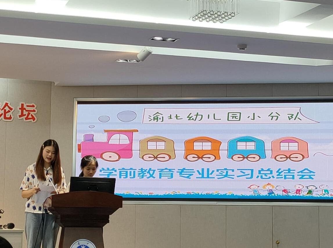 接下来,学前教育班实习同学分别汇报了实习生活经历。北碚缙云幼儿园实习小组代表从保育工作、教学活动、教研工作、特色主题活动、环创工作、小组研讨活动六个方面总结了实习经历;北碚实验幼儿园实习小组介绍了幼儿园的历史、办园理念、课程理念与教育模式等,阐述了实习的经历与收获会伴随一生,成为人生路上一份无价的珍宝;江北新村幼儿园实习小组分享了他们的成长与变化,并从环创主题、色彩搭配、材质选择、环创内容等方面阐述了受到的启发与自身的不足;渝北庆龄幼儿园实习小组代表从幼从专业理念、专业认知、专业技能和职业规划等方面总结了实习的收获,最后发出对学前教育真谛的思考。