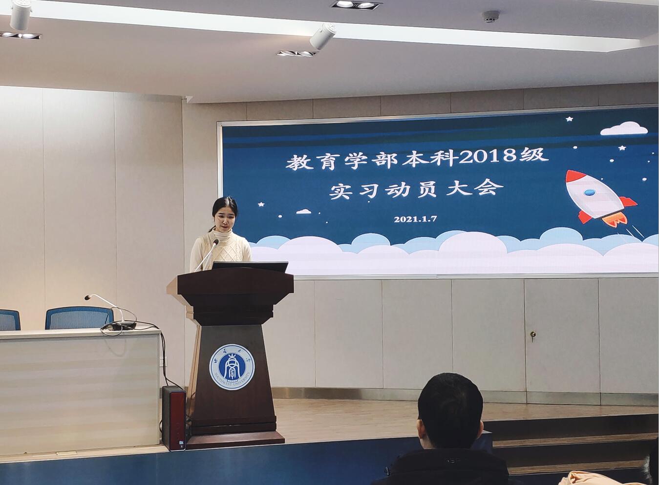 大会伊始,教育学部副部长王正青教授做实习动员讲话。他指出学部高度重视本科生实习工作,为学生创设了高质量的实习教育基地,配备了专业化的实习指导团队;同时他还代表学部对同学们提出了遵守实习纪律、因时转变态度与心态、学会恰当沟通与表达、合理调整学习与生活的关系等要求,并预祝此次实习取得圆满成功。
