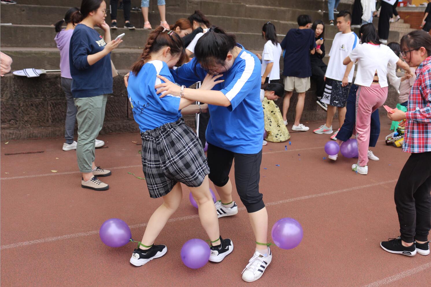 集体项目过后,是有趣的个人项目,同学们都积极参加了自己感兴趣的项目。“踩球大战”中大家都化身为大力士,精准、迅速而有力地踩向对方的气球;“要脸你就输了”中大家纷纷抛弃了自己的偶像包袱,用脸丈量了保鲜膜的厚度,场面热闹无比;除此之外还有让同学们分不清眼鼻嘴的“筷子舞竞走”,惊险刺激的“抢凳子大战”,和让人找不到方向的“你扔我接”。
