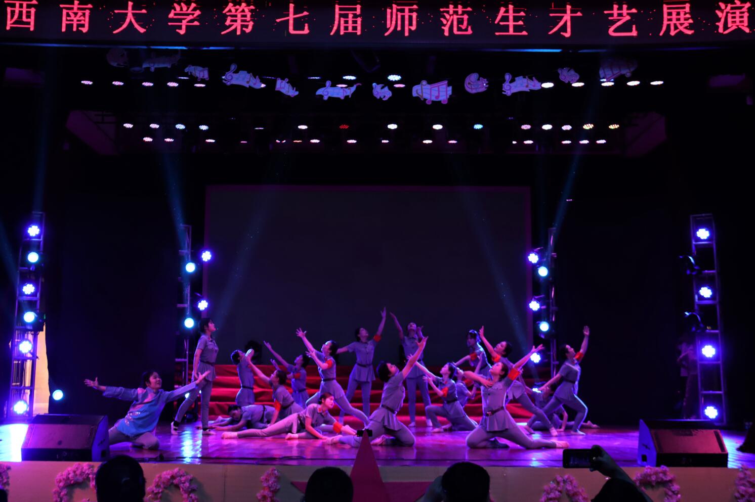 于苦难中挺直脊梁,于战火中浴血奋斗,生命科学学院带来的朗诵《我的墓碑》真情动人,重现了平凡人民战士不平凡的中国魂。写秾华气象,剪长辫更短发;赋秀骨生香,迎风雨成武装。教育学部带来的的舞蹈《那年剪短发》,尽显中国女性巾帼不让须眉的英勇英姿、为家为民为国的无私情怀,肩担重责,心有锦缎,于陋室一间,育桃李万千。在数学与统计学院带来的小品《最后一课》中,乡村教师用画笔描绘乡村教育的蓝天。时间匆匆,流逝猝不及防;情丝万重,默哀光阴逝去。党旗映笑脸,舞蹈献真情,未来教育家联盟倾情演唱歌曲《岁月神偷》,怀旧青春芳华。地理科学学院借舞蹈《忆·嵘》回忆往昔里的峥嵘岁月,纪念战火中的师生情深。五星红旗之下,万里山河永存,历史文化学院 民族学院在朗诵伴舞《红旗颂》流露出身为国人的深深自豪之情。心的教育如夏荷,沁园飘香;爱的教育如春雨,润物无声。心理学部带来的情景剧《“心”路》淋漓尽致地展现了每一位心理教师的使命与担当。美术学院带来的朗诵《光的赞歌》赞美了正义的光芒带来的无穷力量。“历史风云岁月痕,红船依旧显精神”,马克思主义学院带来的舞蹈《红船》充满力量,震撼人心。