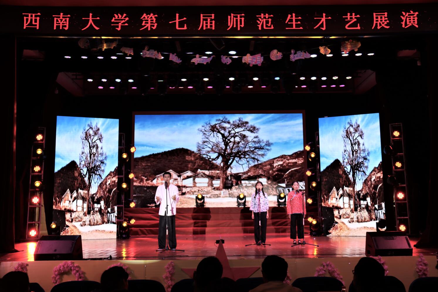 回溯百年历程,不忘坚毅担当,物理科学与技术学院带来的舞台剧《红帽传承咏初心》彰显了志愿者风采,铭刻了雷锋精神。边山月下跋山涉水,用脚步丈量祖国;怀揣热情手捧真心,用教育温暖大地,文学院带来的话剧《疆月朗朗支教情》用教育的“真善美”打动观众的心。化学化工学院在情景剧兼朗诵《以青春之我,颂党之赞歌》中回顾了代代青年奋斗的剪影,借青春旋律谱写了颂党赞歌。热舞激昂,乐声灵动,体育学院带来的舞蹈《健美操有氧舞蹈》尽显青春朝气、活力四射。音乐学院在《原创歌曲串烧》中以动人旋律表达激情澎湃,用动听歌喉绘色流年华章,青春的故事在音符间跳动出别样美丽。计算机与信息科学学院 软件学院在朗诵兼合唱《少年中国说》中表达了少年壮志将不畏逆流阻隔,直击高远苍穹。红星闪烁,有一束光照亮支教的崎岖;支教无声,有一份爱守护孩子的未来。外国语学院借情景剧兼合唱《星星点灯,照亮前程》向不凡的支教老师由衷致敬。