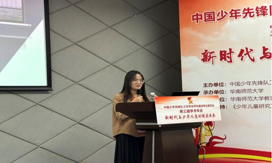 硕士研究生田小雪在分论坛一作《新时代少先队员光荣感:结构要素与提升路径》的学术汇报。田小雪分析了少先队员光荣感的政治情感属性,构建了少先队员光荣感的四维结构要素,并认为要立足少先队员光荣感结构要素,从队前引导、队中滋养和队后保持全过程以增强少先队员光荣感。