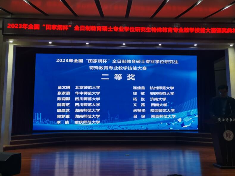 2023年12月3日,2023年全国首届“田家炳杯”全日制教育硕士专业学位研究生特殊教育专业教学技能决赛在陕西师范大学圆满落幕。特殊教育学院院长赵斌教授亲自带队参赛,经过激烈角逐,教育学部特殊教育专业学位研究生文茜获二等奖、贺佳佳获“优秀教学设计奖”,杨柳副教授获“优秀指导教师奖”。