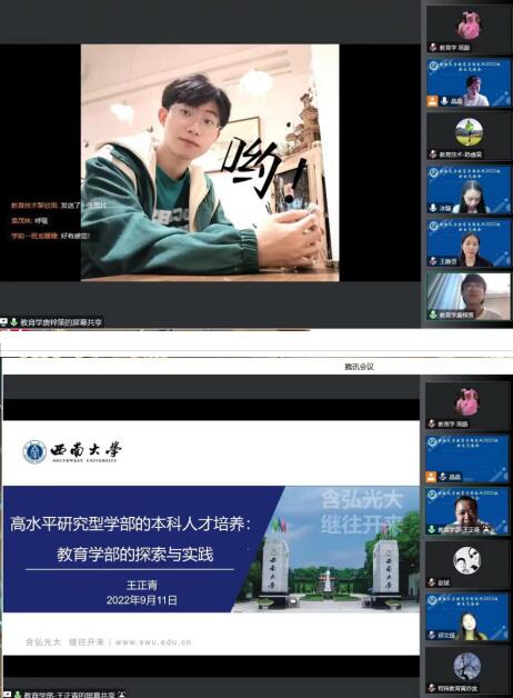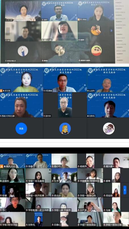 11日下午2点30分,学部举行了本科2022级新生见面会,学部分管本科生工作的党委副书记刘娇、副部长王正青以及各学院院长、辅导员和班主任与新生们在线上开展了热烈的见面仪式,新生们还以班级为单位通过唱歌、连线碰杯等形式向老师们介绍了自己。随后,副部长王正青为同学们做了以《高水平研究型学部的本科人才培养:教育学部的探索与实践》的主题讲座,从学部的办学历史、学科发展、师资力量、本科人才培养等多方面让同学们更加深入的了解学部。接着,各学院分别对新生进行了专业教育,通过介绍专业发展,解读专业人才培养方案以及邀请优秀校友介绍学习工作经验等,提高了新生的专业理解和认同感,为未来的专业学习打下了良好的基础。