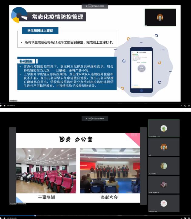 12日下午,新生们在2022级辅导员李晶晶老师的带领下进行了《学生手册》的线上学习,通过学习,同学们才能够在未来学习生活中更好地规范自身行为。之后,李老师从常态化疫情防控管理、日常个人生活安全、财产安全、国家安全等多个方面,结合具体事例为新生们上了一堂安全教育课,增强了学生们的安全和防范意识。接下来,李老师还向新生们介绍了《教育学部本科生“育见”未来综合素质提升计划》,为同学们介绍了学部在培养学生教师基本技能和综合能力素质的各项活动方案。最后,学部团委 学生会以及学部社团组织开展了线上招新活动,为同学们介绍了部门定位、常规工作、干部培养等,展现了学部学生全面发展的风采。