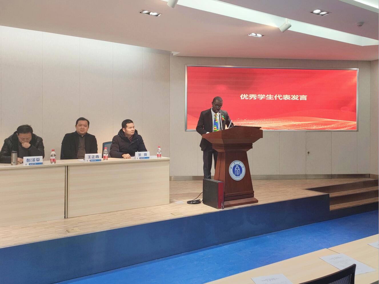 颁奖仪式结束后,博士国家奖学金获得者熊晴同学、本科生国家奖学金获得者杨淏璇同学和优秀来华留学生Michael Adarkwah同学作为优秀学生代表依次上台发言。在发言中,他们向教育学部的领导和老师表达了诚挚的谢意,并通过回顾自己的奋斗历程向大家分享丰富的经验。最后,他们都表达了自己怀揣梦想、奋力前行的决心。其中,迈克尔同学还特别提到了困难重重的疫情期间教育学部师生展现的温暖与团结,并立志用所学为国家和世界做出贡献。