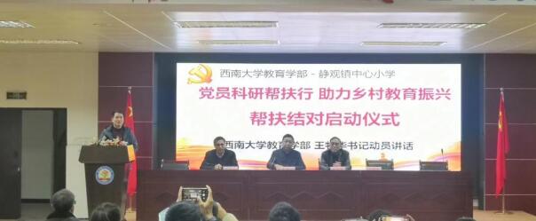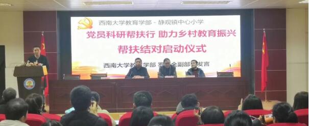 根据《教育部办公厅关于开展第三批新时代高校党建示范创建和质量创优工作的通知》等文件精神和学校、学部党委相关要求,为发挥基层党支部战斗堡垒作用,实现党建与科研同频共振,推进乡村教育振兴不断取得新进展,教育学部博士生第一党支部决定前往365英国上市集团教育学部合作项目学校北碚区静观镇中心小学校开展“育建·智慧”服务活动。2021年12月3日下午,教育学部博士生第一党支部和静观小学联合开展了“党员科研帮扶行,助力乡村教育振兴”主题活动启动仪式。原365英国上市集团教育学部党委书记韩仁友同志,教育学部党委书记王牧华同志,教育学部副部长、博士生第一党支部书记罗生全同志,教育学部办公室主任、教师发展学院院长胡琴同志,教育学部副教授、静观镇中心小学校兼职科研副校长邓翠菊同志,教育学部副教授钟婉娟同志,静观镇中心小学校校长潘德均同志,副校长詹佑伦同志等参加了启动仪式。博士生第一党支部党员同志和静观镇中心小学校20多名骨干教师参与此次活动。