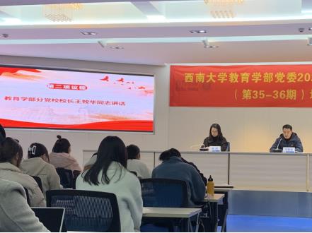 为深入学习贯彻习近平新时代中国特色社会主义思想,深入学习领会习近平总书记“七一”重要讲话精神,引导入党积极分子党性修养和政治理论水平,保证党员发展质量,教育学部党委举办2021年下半年入党积极分子培训班。11月19日19:00,党委在811报告厅举行了2021年入党积极分子培训班开学典礼。党委书记、分党校校长王牧华同志、副书记、副校长卓玉兵同志、刘娇同志、教务长、组织员李佳同志和全体学员参加了开学典礼。