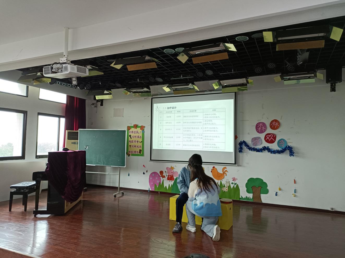 第一节课由学生汇报自己的音乐治疗干预方案。第一小组三位同学以“以音乐治疗配合行为改变技术方案改善一位自闭症儿童自伤行为”进行了汇报,第二小组三位同学以“自闭症音乐治疗案例与方案设计”进行汇报。每组汇报结束后,贾老师都会引导同学们提出自己的疑问和建议,之后由贾老师进行点评,指出每组的优点和不足,并提出改进建议。