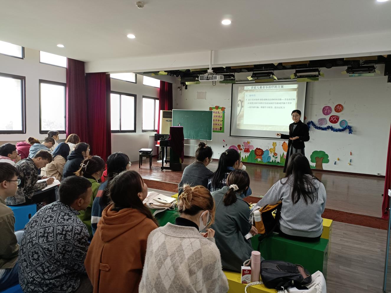 第二节课贾老师对“多动症儿童的音乐治疗”进行了讲解。在教学的过程中,贾老师结合视频、案例对教学重点和难点进行了深入的解析。通过这节课的学习,学生了解了多动症儿童的特点,多动症儿童音乐治疗方案的制定与实施。