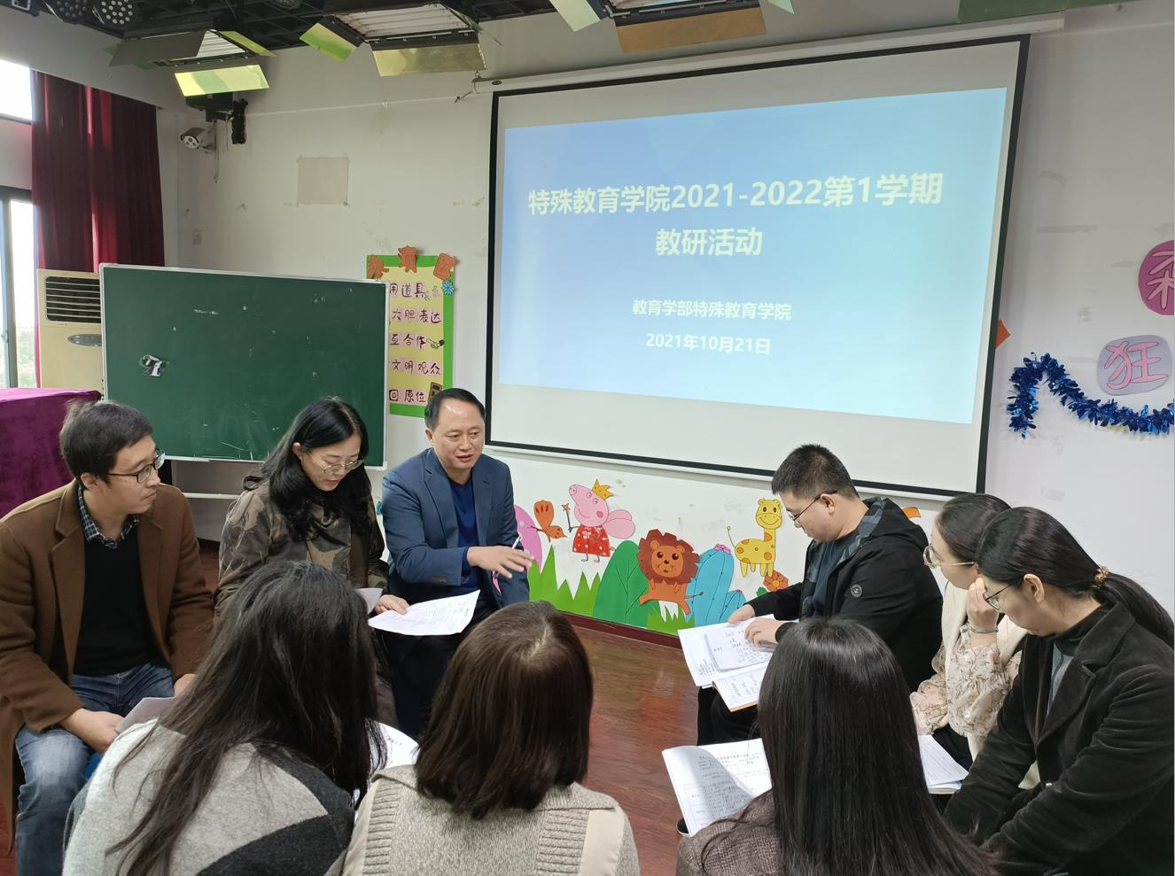 2021年10月21日,特殊教育教研室专任教师在田家炳楼712小剧场开展本学期听评课教研活动。本次教研活动由贾添天老师执教,授课对象为学部2019级特殊教育专业本科生,授课课程为专业发展选修课《特殊儿童音乐治疗》。