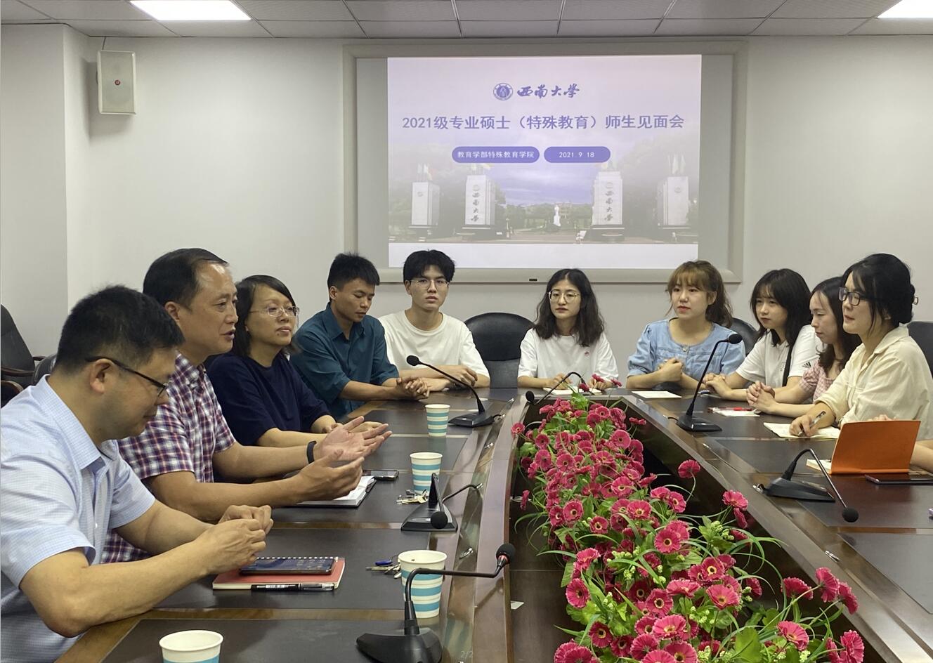 2021年9月18日下午,特殊教育专业2021级研究生师生见面会在教育学部403会议室顺利举行。会议由特殊教育学院院长赵斌老师主持,副院长李欢老师、杨柳副教授、阳泽副教授及2021级研究生新生出席见面会。