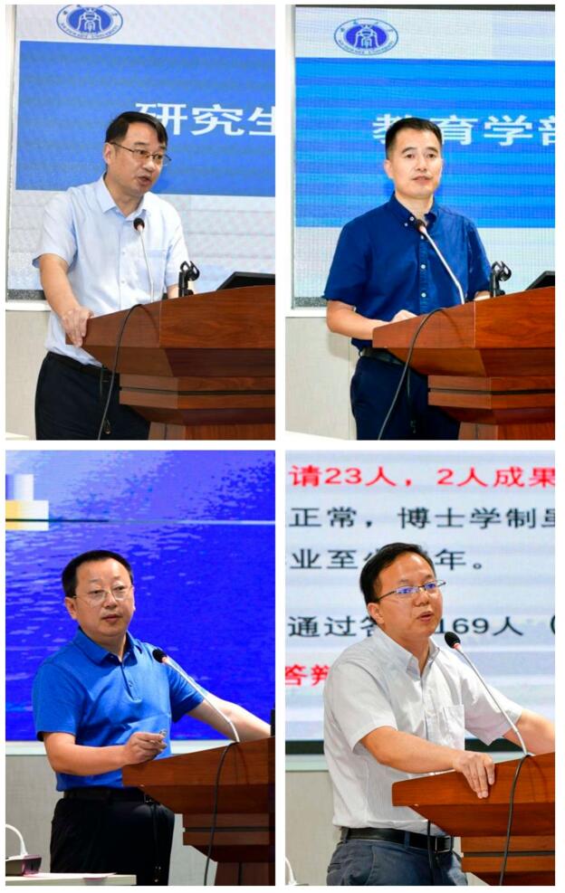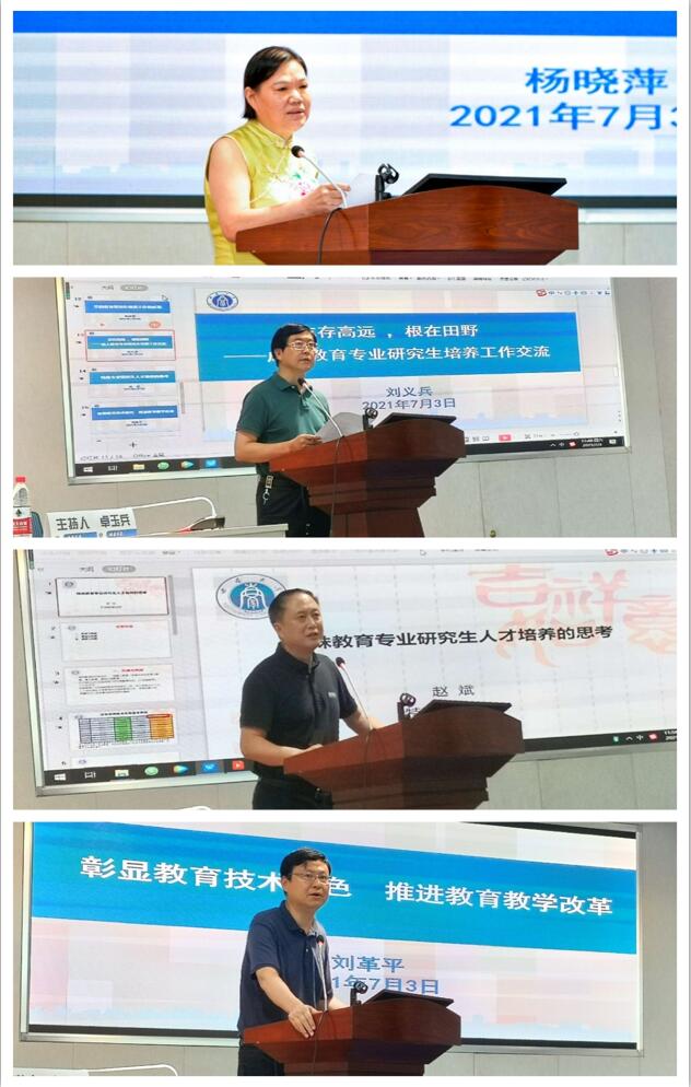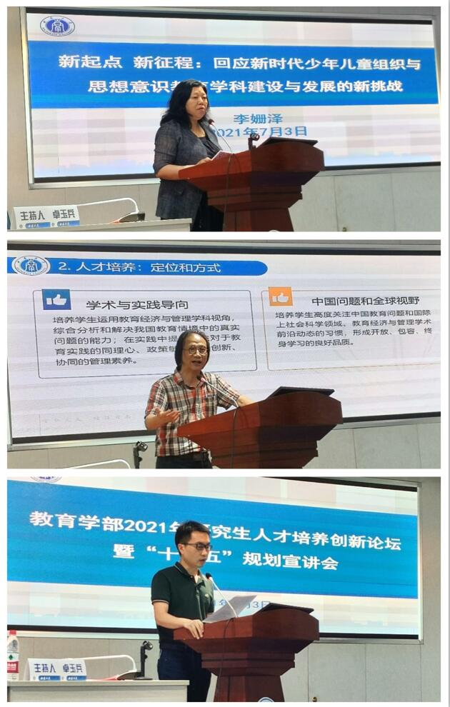 之后,学部各二级学科负责人分别就学科研究生人才培养做分享汇报。基础教育学专业负责人宋乃庆教授基对研究生人才培养提出四点建议:1.加强对基础教育学学科发展的重视;2.促进跨学科联合培养,实施主、副导师负责制;3.广泛宣传,吸引优秀生源;4.推动学科交叉与融合。课程与教学论专业汇报人赵鑫教授提出课程与教学论专业学科发展与人才培养面临瓶颈和挑战,提出需要从强化学科认同感与归属感、挖掘与利用学术资源、制定评价体系和搭建跨学科、跨学术的校内平台四个方面加强学科建设和人才培养。教育学原理专业负责人孙振东教授提出研究生人才培养要提高专业意识和学术标准,保障教育学原理研究生培养质量。他强调要让学生意识到自己的研究者身份,培养个人的专业意识,与此同时要充分发挥导师督导作用,通过实践调研等相关活动提高学术质量。教育史专业负责人谢长法教授强调入学教育作为开学第一课的重要性,提出必须要进一步完善课程设置,并对读书、学术、人生三者间的关系进行深入探讨。比较教育学专业汇报人王正青教授归纳了学科发展的历史,总结了学科发展所取得的成就,概括了该专业人才培养的相关举措,提出研究生人才培养必须进一步凝练学科方向、强化方法训练、鼓励学术交流。学前教育学专业负责人杨晓萍教授总结了学前团队的经验,指出要从资源、体制、特色工程建设和人才选拔等方面推进学科的建设。成人教育学专业负责人刘义兵教授提出成人教育专业研究生的培养目标应为:志存高远,根在田野,并从创建学科体系与话语体系、培养深厚的专业情怀、重视多元学术成果等方面描绘了专业的发展蓝图,强调要找准成人教育学在教育学部学科体系中的定位。特殊教育学专业负责人赵斌副教授指出特殊教育作为起步最晚的专业,在生源质量和师资力量方面都存在一定困难,在专业发展上也是机遇与挑战并存,必须重视跨学科的研究,在研究生人才培养上建议要做到科研与实践相结合。教育技术学专业负责人刘革平教授对该专业的发展情况进行总结,提出研究生人才培养要从完善科研实践体系、开设混合式课程等方面加以改进。少年儿童组织与思想意识教育专业负责人李姗泽教授认为该专业作为一个新专业、新研究领域,仍处在“摸着石头过河”的发展阶段,研究生人才培养必须强化马克思主义基本理论与教育学理论的学习,鼓励学生进行深入实际的研究。教育经济与管理专业负责人张学敏教授就学科团队、人才培养等方面进行探讨,提出要以科教协同,研学育人作为未来的改进方向,不断强化学科基础。