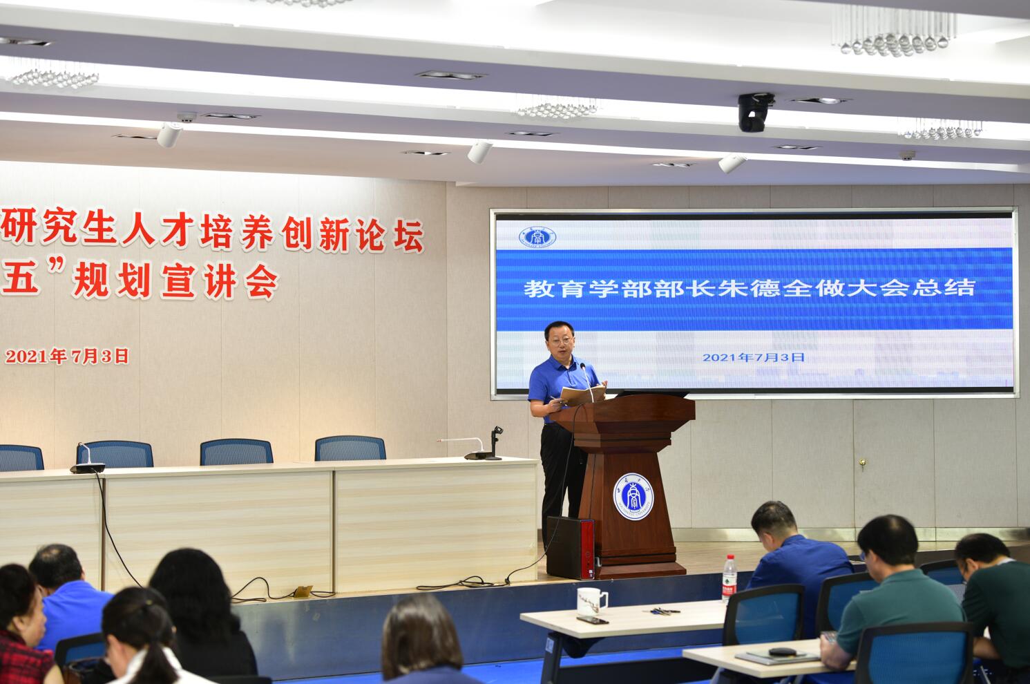 为全面贯彻落实全国研究生教育会议精神,进一步深化学部研究生教育改革,推进研究生教育培养模式创新,提高研究生人才培养质量,2021年7月3日,学部在田家炳教育书院召开“教育学部2021年研究生人才培养创新论坛暨‘十四五’规划宣讲会”,学校研究生院副院长徐一鸣、国际学院院长刘承宇、教育学部部长朱德全、党委书记王牧华、党委副书记卓玉兵、副部长彭泽平、副部长罗生全、副部长王正青出席了会议,学部全体研究生导师、研究生辅导员及研究生班主任参加了会议。会议由党委副书记卓玉兵主持。