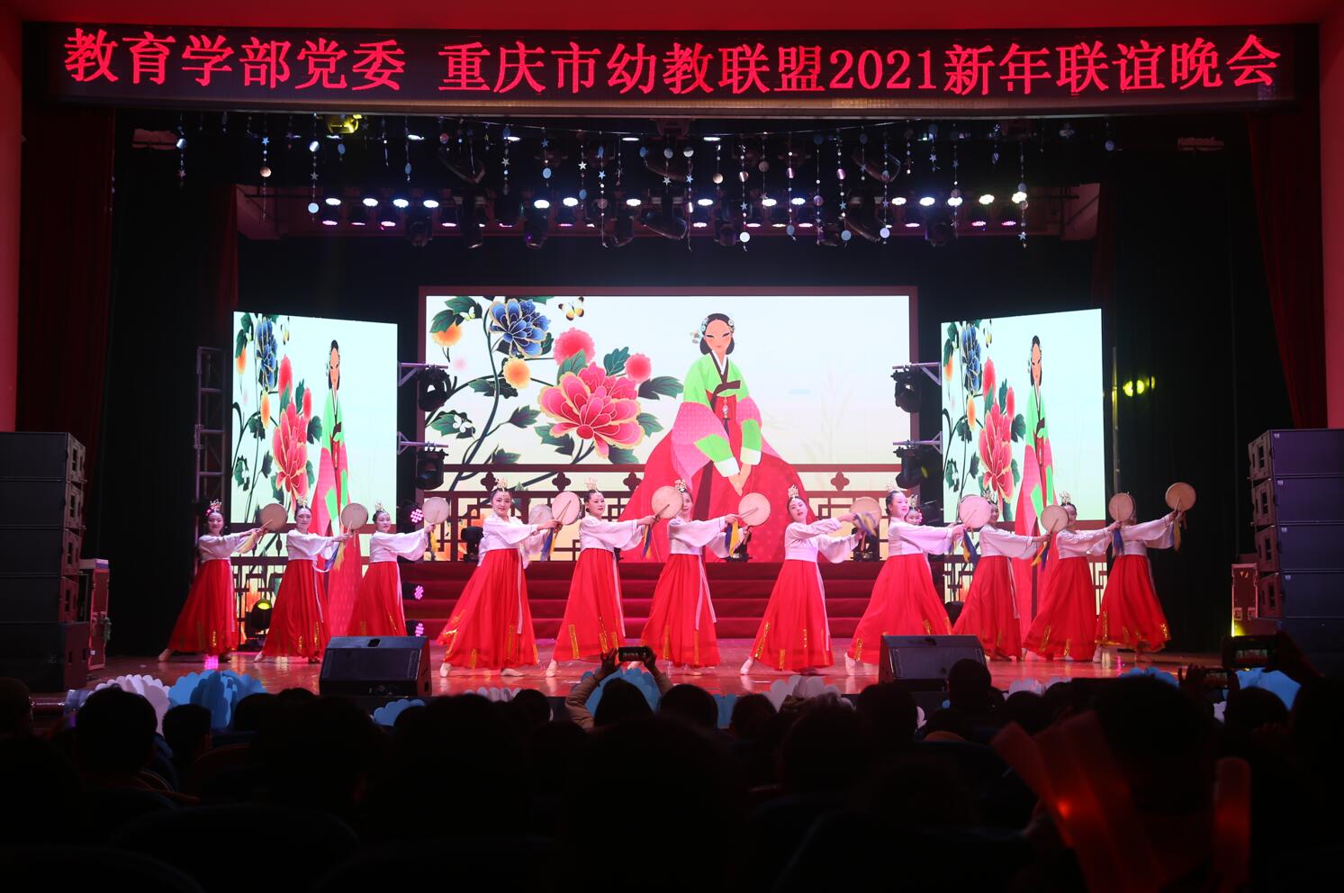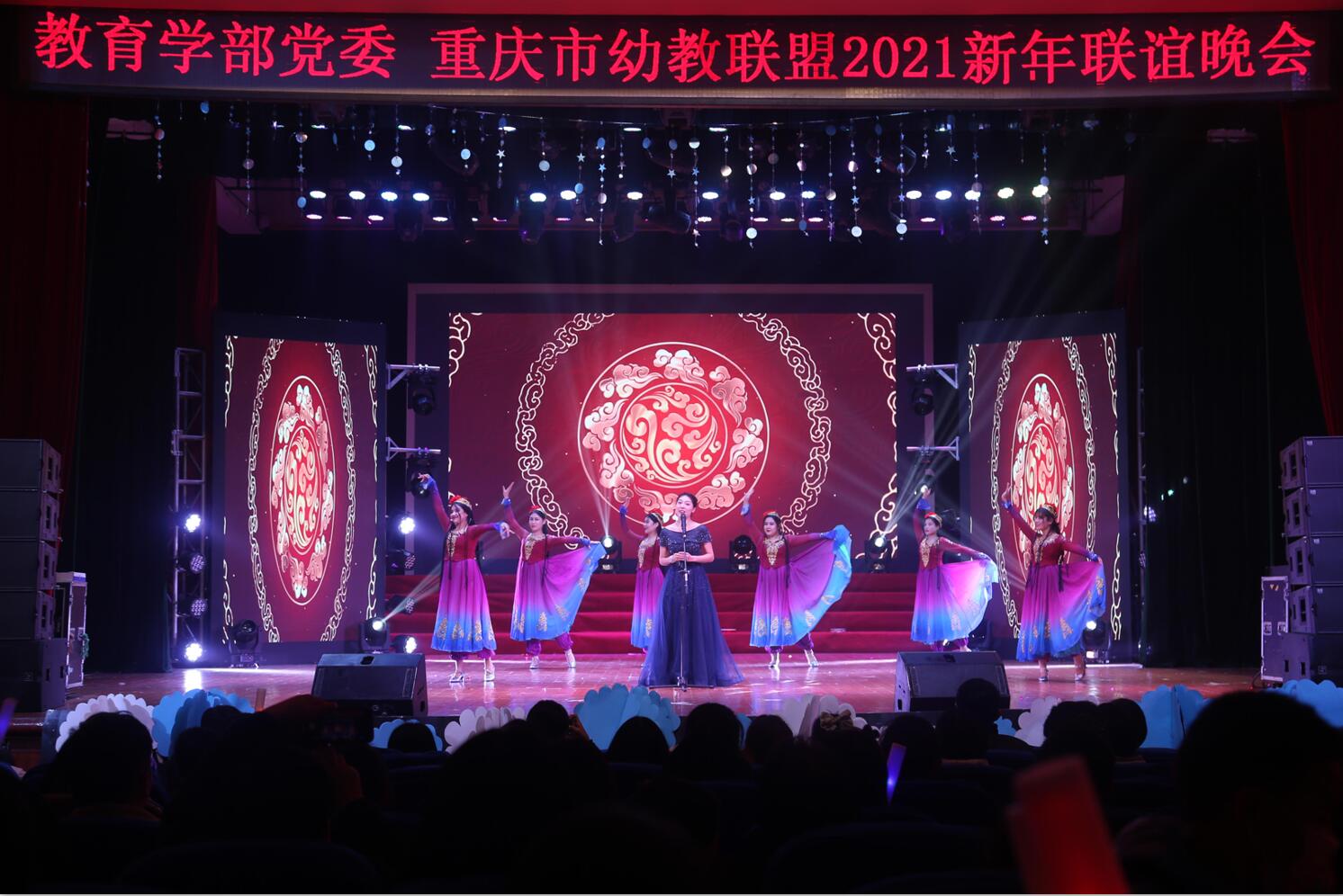 吹来漫山红花,踏响红歌旋律,研究生艺术团带来的舞蹈《映山红》笛声悠扬、舞姿曼妙,引得现场掌声雷动。2020级博士生带来的歌舞《乘风破浪的博士僧》别出心裁,充分体现了学部博士生的别样风采。哈萨克族的奔放、土家族的淳朴、蒙古族的豪迈、维吾尔族的浪漫——本科生少数民族同学以《轻舞飞扬》的民族舞蹈串烧为党的百年征途真情献礼。最后,研究生2019级一班带来舞蹈《Maria》,用动感炫酷的舞蹈为本次晚会画上了完美的句点。至此,“初心奕奕,征途百年”365英国上市集团教育学部党委 重庆市幼教联盟2021新年联谊晚会圆满结束。