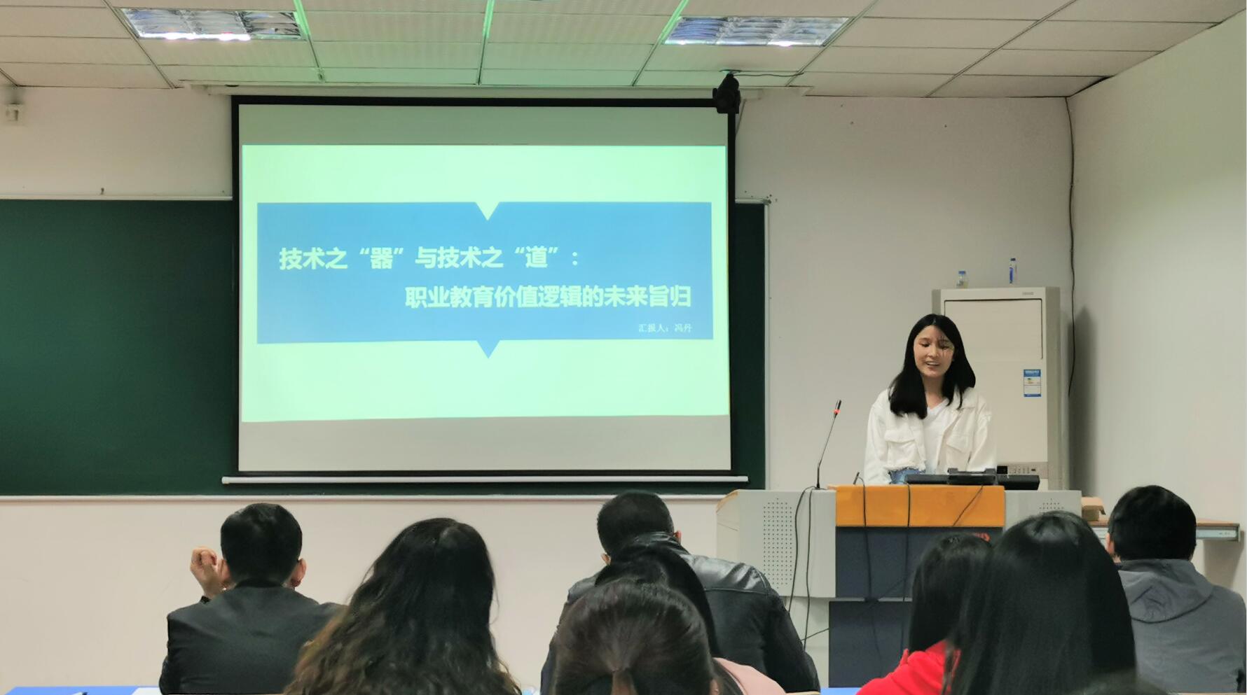 冯丹同学以《技术之“器”与技术之“道”:职业教育价值逻辑的未来旨归》为题,将互联网、人工智能、大数据及区块链等技术在教育中比作时代之“器”,从“为何构建技术之道”的价值论、“何以构建技术之道”的实践论与“技术之道何样”的本体论去探寻职业教育的价值逻辑。