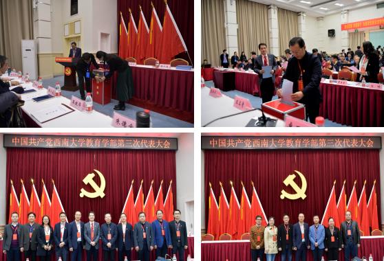 大会在庄严的《国际歌》歌声中圆满闭幕。随后,教育学部第三届党委、纪委召开了第一次全体会议,严格按照程序选举产生了党委书记、副书记和纪委书记。王牧华同志当选教育学部党委书记,朱德全、卓玉兵、刘娇三位同志当选教育学部党委副书记,卓玉兵同志当选教育学部纪委书记。