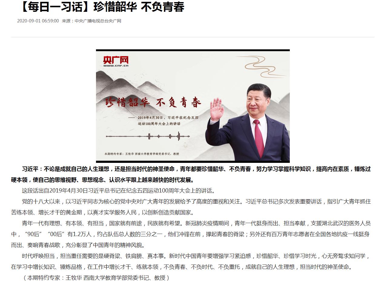 9月1日,中央广播电视总台央广网《每日一习话》栏目特约教育学部党委书记王牧华教授,围绕“当代中国青年的使命与担当”畅谈学习习近平总书记有关重要论述的体会,以“珍惜韶华,不负青春”为题刊播特约文章及音频。