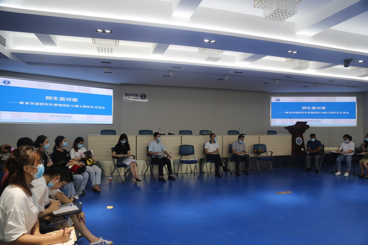 为了贯彻全国研究生教育会议的精神,全面调研学部研究生教育的现状,为推进学部研究生教育改革做铺垫、准备,全面提升学部研究生教育质量,落实立德树人根本任务,2020年9月8日上、下午,教育学部在田家炳教育书院811报告厅室召开了两场“师生面对面——学部研究生管理团队与研究生交流会”,学部分管研究生教育工作副部长彭泽平教授、学部分管研究生思想政治工作党委副书记、纪委书记卓玉兵老师、学部教育研究院院长唐智松教授、学部研究生教育办公室主任秦荣芳老师、学部研究生辅导员李佳老师、学部教学办公室主任、研究生辅导员田京巾老师、学部研究生辅导员李清老师以及50余名博士、硕士研究生代表参加了本次交流会。