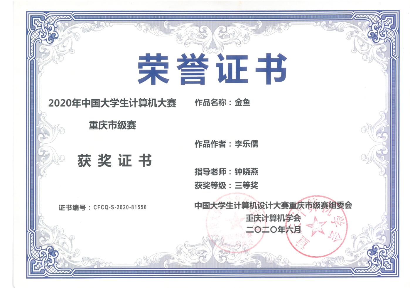 我院学子在2020年中国大学生计算机设计大赛重庆市级赛荣获三等奖