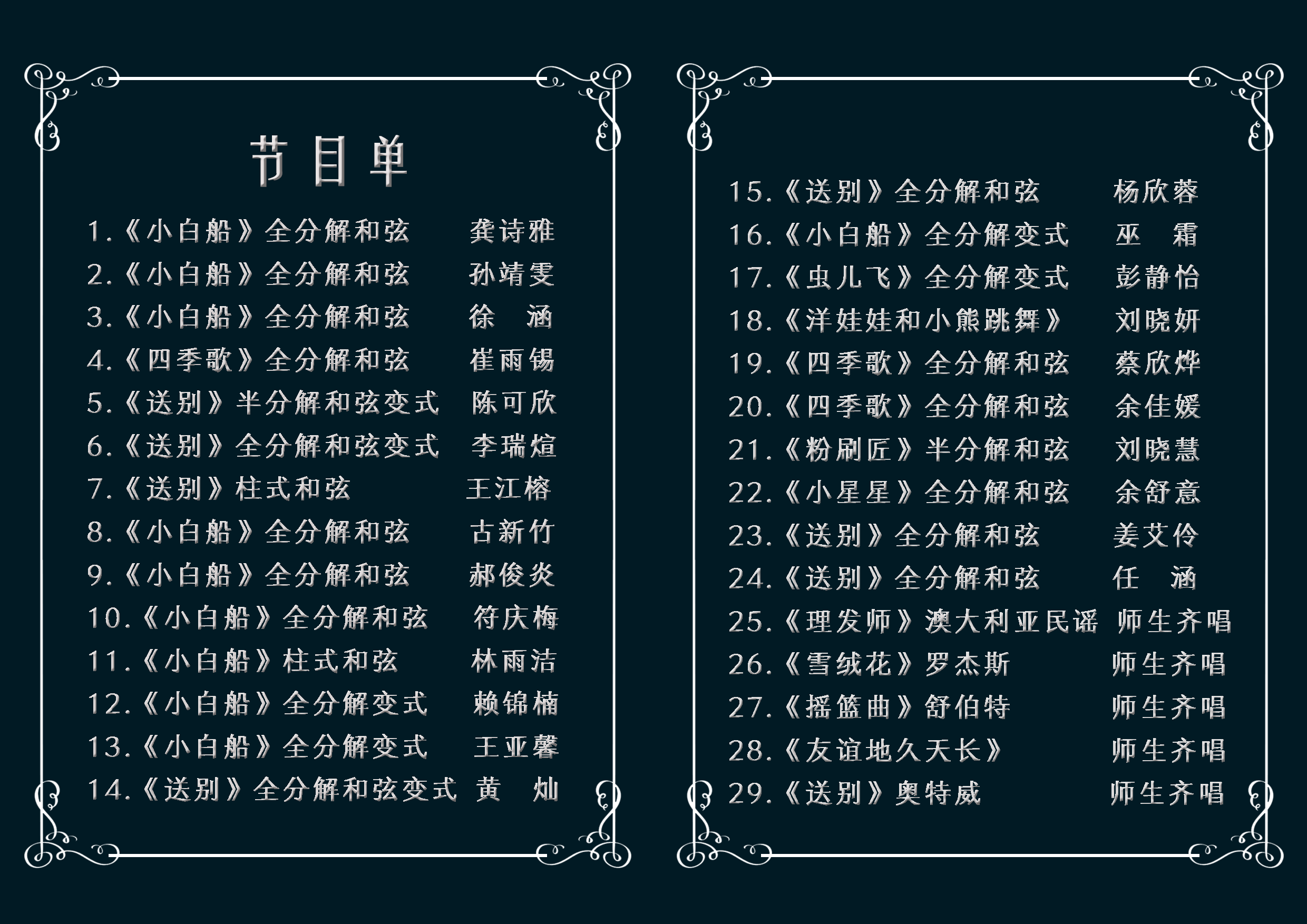 本次汇报表演所有曲目均由学生自主配奏、自弹自唱完成。因为疫情的影响,未返校的同学进行线上汇报。汇报节目别具特色:《洋娃娃和小熊跳舞》节奏活泼欢快,充满童真童趣;《小白船》编织出儿童的希望与梦想;《四季歌》歌颂了纯洁、真挚的情感;《送别》传递了好朋友离别时依依不舍的伤感。